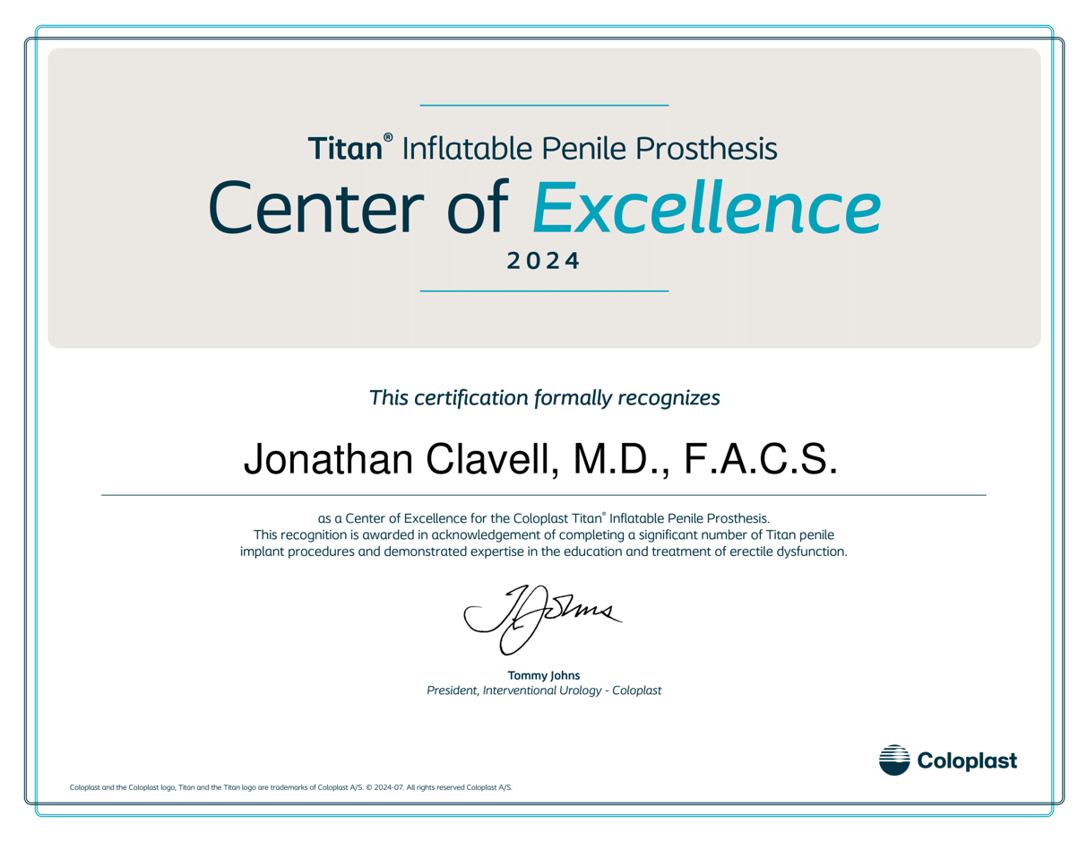 Jonathan Clavell, M.D., F.A.C.S., is a board-certified urologist who is fellowship-trained in Sexual Medicine and is committed to providing the highest quality care to patients throughout the Southwest. Our team is dedicated to offering men a wide range of quality urology services including treatments for erectile dysfunction, BPH, Peyronie’s Disease, vasectomy procedures, and more.